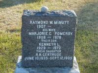 Raymond Wesley McNutt was born in 1907 at Brighton Twp., Northumberland Co., Ontario; Date 1907 per Memorial. Date 1907 & location Brigton Twp. per CemSearch.1,2 He married Clara Marjorie Pomeroy, daughter of John Blake Pomeroy and Georgina Gertrude White, on 26 October 1927 at Ontario; Date Oct 26 1927 per CemSearch.1 Raymond Wesley McNutt died on 7 November 2003 at Warkworth, Northumberland Co., Ontario; Date Nov 7 2003 & location Warkworth per CemSearch.1 He was buried on 10 November 2003 at Warkworth Cemetery, Warkworth, Northumberland Co., Ontario; Memorial: (See Exhibit) Raymond W. McNutt; 1907 - ; His Wife; Marjhorie C. Pomeroy; 1908 - 1978; Their Son; Kenneth L; 1929 - 1973; Their Daughter; r. R. Gertrude; June 10, 1935-Sep 12, 1935 (Warkworth Cemetery, Warkworth)