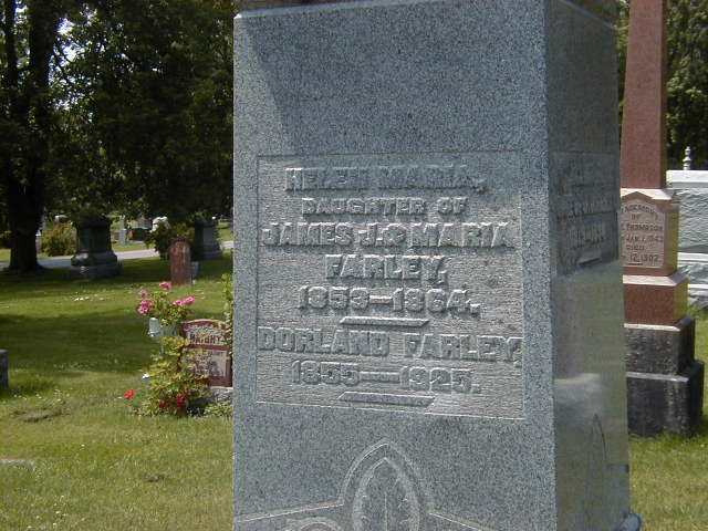 Helen Maria Farley was born in 1853 at Hastings Co., Canada West; Date 1853 per Memorial.1 She was buried in 1864 at Belleville Cemetery, Beleville, Hastings Co., Canada West; Memorial: (See Exhibit) Helen Maria; Daughter of; James J. & Maria; Farley; 1853 - 1864; Dorland Farley; 1855 - 1925 (Belleville Cemetery, Belleville, June 22 2006.)1 She died in 1864 at Hastings Co., Canada West; Date 1864 per Memorial.1