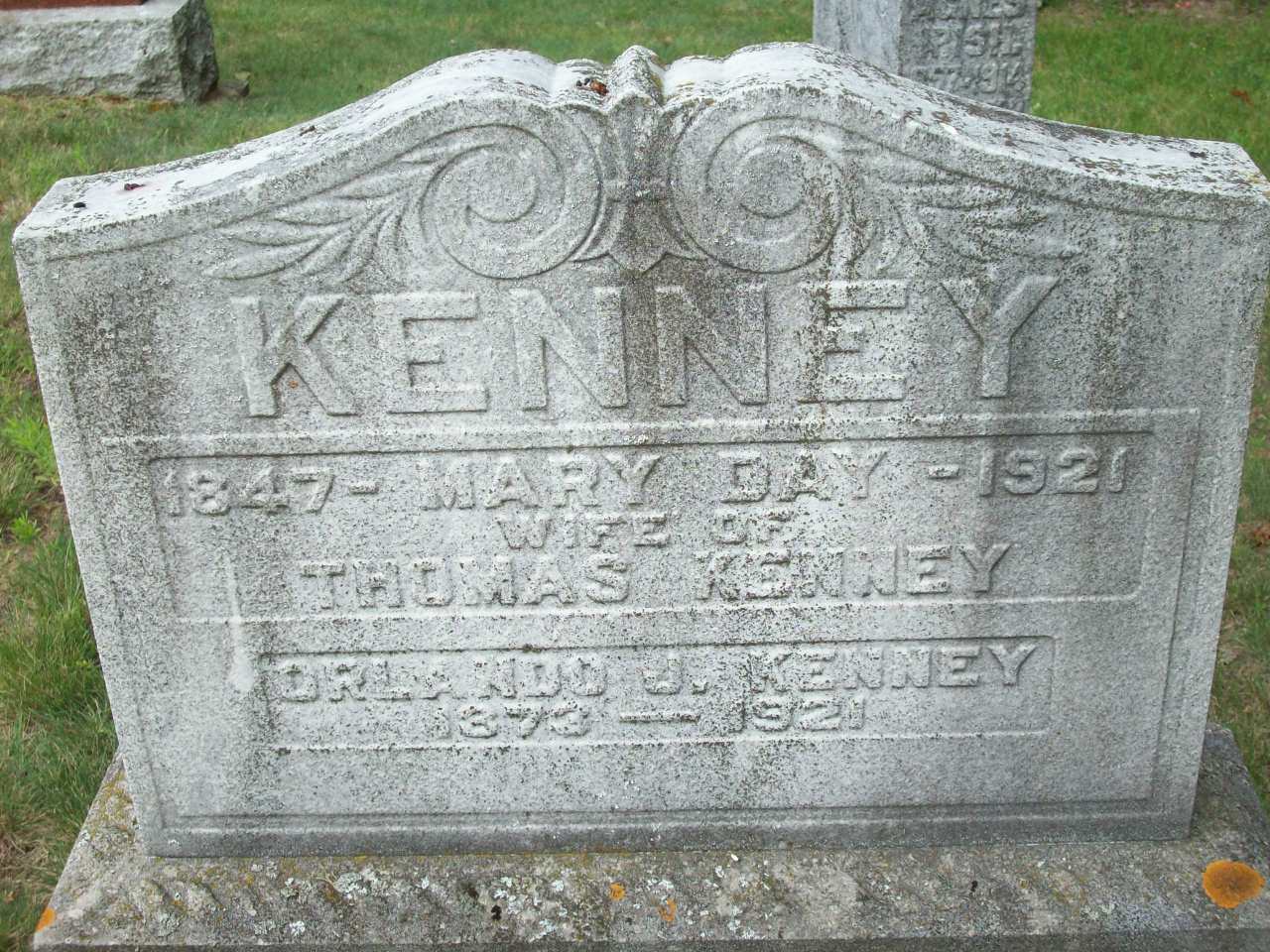 Mary Day was born in 1847 at Camden Twp., Lennox & Addington Co., Canada West; Date 1847 per Memorial. Date 1846 & location Camden per marriage register.1,2 She lived on 21 December 1868 at Brighton Twp., Northumberland Co., Ontario; Residence Brighton Twp. per marriage register.1 As of 21 December 1868,her married name was Kenney.1 She married Thomas Kenney, son of William Kenney and Jane Ann Trinnear, on 21 December 1868 at Cramahe Twp., Colborne, Northumberland Co., Ontario; Marriage Register: Groom: Thomas Kenney; Age: 25; Res.: Brighton Twp; Born: Ireland; Parents: William & Ann Kenney; Bride: Mary Day; Age: 22; Res.: Brighton Twp; Born: Camden; Parents: Orland & Lucinda Day; Date: Dec 21 1868; Place: ?Colborne? Township, Northumberland Co. (Ontario Marriage Registers, 1826-1937, ancestry.ca)(Location would be the town of Colborne in Cramahe Township.)1 Mary Day was buried in 1921 at Woods Cemetery, Cramahe Twp., Northumberland Co., Ontario; Memorial: (See Exhibit) KENNEY; 1847 - Mary Day - 1921; Wife of; Thomas Kenney; Orlando J. Kenney; 1873 - 1921 (Woods Cemetery, Cramahe Twp., July 6 2009.)2 She died in 1921 at Ontario; Date 1921 per Memorial.2