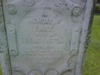 Emily Dulmage was born on 9 January 1852 at Canada West; Date Jan 9 1852 per Memorial - age 25y 9m 12d at death Oct 21 1877.1 As of circa 1872,her married name was Metcalfe.1 She married Edward R. Metcalf, son of John Metcalf and Eliza L. Ackerman, circa 1872 at Ontario.1 Emily Dulmage died on 21 October 1877 at Ontario at age 25; Date Oct 21 1877 per Memorial.1 She was buried on 23 October 1877 at Salem Cemetery, Cramahe Twp., Salem, Northumberland Co., Ontario; Memorial: (See Exhibit) In; Memory of; Emily; Wife of; Edward R. Metcalf; Who Died; Oct. 21, 1877; Aged 25 Y'rs 9 M's; & 12 D's (Salem Cemetery, Cramahe Twp., July 4, 2009.)1