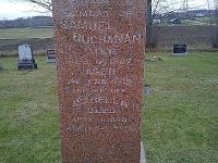 Note: This page has been mis-filed!! This is clearly Seymour Township people but it is filed under Haldimand. There is no township name on the page, so someone guessed. (Dan Buchanan, May 7 2021.)3 He died on 17 February 1867 at Seymour Twp., Northumberland Co., Canada West; Date Feb 17 1867 per Memorial.2 He was buried on 19 February 1867 at Burnbrae Cemetery, Seymour Twp., Northumberland Co., Canada West; Memorial: (See Exhibit) In; Memory of; Samuel; Buchanan; Died; feb. 17, 1867; Aged; 74 ? D's; and his wife; Isabella; Died; April 11? 1860; Aged 64 Y'rs. (Burnbrae Cemetery, Seymour Twp., Nov 26 2011)