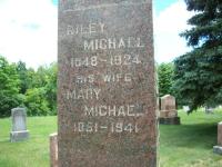 William "Riley" Michael was born on 27 September 1848 at Ameliasburgh Twp., Prince Edward Co., Canada West; Date 1848 per Memorial & CemSearch. Date 1848 & location Ont. per 1921 Census. Date Sep 27 1849 & location Ont. rural per 1901 Census. Date 1849 & location Ont. per 1871 Census. Date 1847 & location UC per 1861 Census. Date 1848 & location Cda. per marr. reg'n.1,2,3,4,5,6,7 He appeared on the census of April 1861 at Ameliasburgh Twp., Prince Edward Co., Canada West; Age 14 at 1861 Census: see Abraham Michael.5 He lived on 4 October 1869 at Brighton Twp., Northumberland Co., Ontario; Residence Brighton Twp. per marr. reg'n. - Mary Young.2 He married Mary Damarus Young, daughter of John Andrew Young and Susan Nix, on 4 October 1869 at Brighton, Northumberland Co., Ontario; Marriage Reg'n.Gen #1481: Groom: William Raley; Age: 21; Res.: Brighton Twp; Born: Cda; Status: bachelor; Occ.: farmer; Parents: Abel M. & Jane Raley; Bride: mary Young; Age: 18; Res.: Consecon; Born: Cda; Status: spinseter; Parents: John & Susan Young; Wit.: Johnson Young & Lucretia Michael; Date: Oct 4 1869; Place: Brighton; Rel.: WM; Performed by: Dr. Freshman, by license, Northumberland & Durham (Ontario Marriage Registration, ancestry.ca)