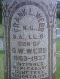 CemSearch: Name: Frank L. Webb; Born: 1863; Died: 1937; Age: - ; ID: SALEM0150; Other names: Webb, Ann Alida [Keller]( -1913), Webb, Charles W. ( -1891), Webb, George W. ( -1889); Cemetery: Salem Cemetery, Con 1 Lot 21 Cramahe Twp., Village of Salem, Sec 2 Row 32 Plot 17; Note: KC, BA, LLB, Son of George W. Webb & Ann Alida Keller, Sibling of Charles W. Webb, BA, Interred Mt. Pleasant Cem., Toronto (https://www.cemsearch.ca/burial/?pID=SALEM0150%5E3)