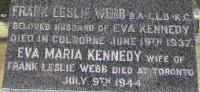 Eva Maria Kennedy was born in 1866 at Toronto, York Co., Canada West; Date 1866 & location Toronto per marr. reg'n.1 She lived on 23 December 1895 at Toronto, York Co., Ontario; Residence Toronto per marr. reg'n.1 As of 23 December 1895,her married name was Webb.1 She married Frank Leslie Webb, son of George Washington Webb and Ann Alida Keller, on 23 December 1895 at Toronto, York Co., Ontario; Marriage Reg'n.#015303: Groom: Frank Leslie Webb; Age: 32; Res.: Colborne; Born: Cda; Status: bachelor; Occ.: Barrister at law; Parents: George Washington & Ann Alida Webb; Bride: Eva Maria Kennedy; Age: 29; Res. & Born: Toronto; Status: spinster; Parents: Warring & Jane Kennedy; Wit.: David Holy & Madeline Walker; Date: Dec 23 1895; Place: Toronto; Rel.: Meth; Performed by: John Potts (Ontario Marriage Registration, #015303-1895, ancestry.ca.)2 Eva Maria Kennedy died on 19 July 1944 at Toronto, York Co., Ontario; Date July 19 1944 & location Toronto per Memorial.3 She was buried on 22 July 1944 at Mount Pleasant Cemetery, Toronto, York Co., Ontario; Memorial: ( See Exhibit) Frank Leslie Webb B.A.-L.L.B-K.C; Beloved Husband of Eva Kennedy; Died in Colborne June 19th 1937; Eva Maria Kennedy wife of; Frank Leslie Webb died at Toronto; July 19 1944 (Mout Pleasant Cemetery, Toronto, image from FindaGrave.)3