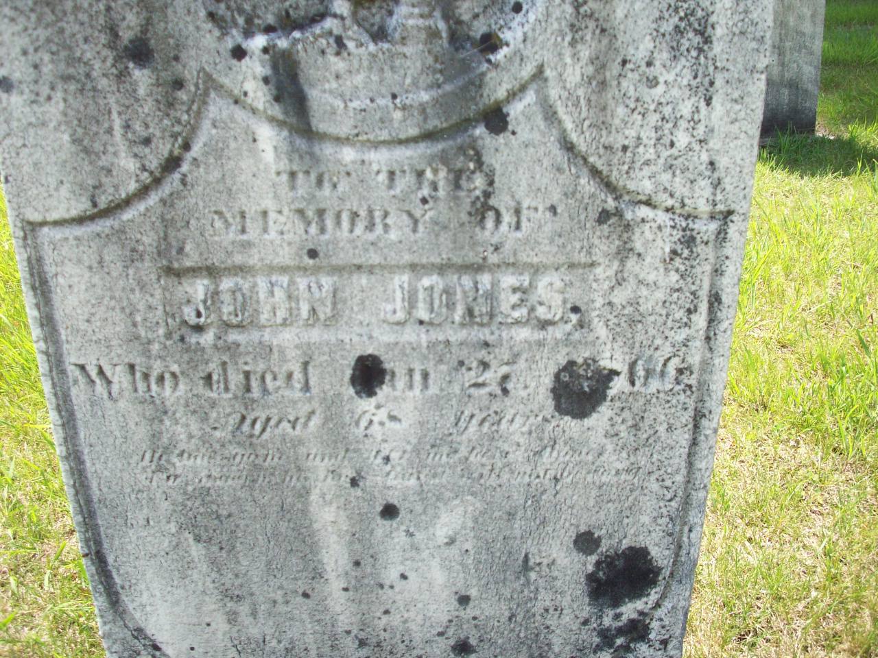 CemSearch: Name: John Jones; Born: 1798; Died: Jan 27 1866; Age: 68y; ID: CSTLN116A; No other names; Cemetery: Castleton Cemetery, Conc 7, Lot 32, Cramahe Twp., Village of Castleton, Northumberland Co., Sec A-S Row 7 Plot 18; Note: old slab (https://www.cemsearch.ca/burial/?pid=CSTLTN116A%5E0.)3,4