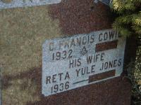 Reta Jean Yule was born on 1 May 1936 at Percy Twp., Dartford, Northumberland Co., Ontario; per family tree of DonnaCowie39 on ancestry.ca, Sep 25 2020.1 As of 26 July 1958,her married name was Jones.1 She married Ralph Orley Jones, son of Henry Clare Jones and Maud Tuck, on 26 July 1958 at Ontario; per family tree of DonnaCowie39 on ancestry.ca, Sep 25 2020.1 As of 22 July 1989,her married name was Cowie.1 Reta Jean Yule died on 26 December 2009 at Cobourg, Northumberland Co., Ontario, at age 73; per family tree of DonnaCowie39 on ancestry.ca, Sep 25 2020.1 She was buried on 29 December 2009 at Castleton Cemetery, Castleton, Northumberland Co., Ontario; Memorial: (See Exhibit) C. Francis Cowie; 1932 - ; His Wife; Reta Yule Jones; 1936 - (Castleton Cemetery, Cramahe Twp., Apr 28 2007.)2