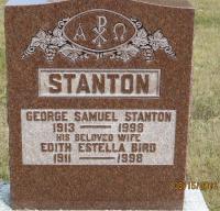 George Samuel Stanton was born on 28 December 1913 at Cramahe Twp., Northumberland Co., Ontario; Birth Reg'n.#041294: Name: George Samuel Stanton; Date: Dec 28 1913; Place: Cramahe Twp; Parents: Samuel George Stanton, farmer, Brighton & Beatrice F. Ball; Phys.: Dr. Wade; Inf.: Samuel Stanton, Brighton; Reg'd.: Dec 29 1913; Reg'r.: C. A. Wilson, Castleton (Ontario Birth Registration, #041294-1913, ancestry.ca) Date 1913 per Memorial & FindaGrave. Date 1914 & location Brighton, Ont. per marriage reg'n.3,4,5 He lived on 14 August 1937 at Belleville, Hastings Co., Ontario; Residence Belleville per marr. reg'n.1 He married Edith Estella Bird, daughter of Newton Richard Bird and Sarah J. Bell, on 14 August 1937 at Belleville, Hastings Co., Ontario; Marriage Reg'n.#014206: Groom: George Samuel Stanton; Age: 23; Res.: Belleville; Born: Brigton, Ont; Status: bachelor; Occ.: accountant; Rel.: Pres; Parents: Samuel George Stanton & Beatrice Ball; Brde: Edith Estella Bird; Age: 26; Res.: Belleville; Born: Sidney Twp; Status: spinser; Occ.: stenographer; Rel.: Unitech Church; Expected Res.: Belleville; Wit.: Kenneth M. & Evelyn Pauline Bird, North Front St., Belleville; Date: Aug 14 1937; Place: Belleville; Performed by: D. S. McClintock, 246 Church St., Belleville, United Church; Sworn: Stirling, Aug 6 1937; Reg'r.: G. N. Leuery, Stirling (Ontario Marriage Registration, #014206-1937, ancestry.ca.)6 George Samuel Stanton lived in 1940 at 177 North Front St., Belleville, Hastings Co., Ontario; "North Front Street ... 117 Stanton, George S., merchant ... 322" & "117 Stanton, Mrs. George - ... 323" Canada Voter Lists, 1940, Hastings Co., Belleville, pg. 50 of 193, ancestry.ca.)7 He died on 10 March 1998 at Belleville, Hastings Co., Ontario, at age 84; Date 198 per Memorial & FindaGave. Date Mar 10 1998 & location Belleville per family tree of Penny Ellen McIlraith on ancestry.ca, Dec 18 2020.8,4,5 He was buried on 13 March 1998 at Stirling Cemetery, Stirling, Hastings Co., Ontario; Memorial: (see Exhibit) STANTON; George Samuel Stanton; 1913 - 1998; His Beloved Wife; Edith Estella Bird; 1911 - 1998 (Stirling Cemetery, Stirling, from FindaGrave)