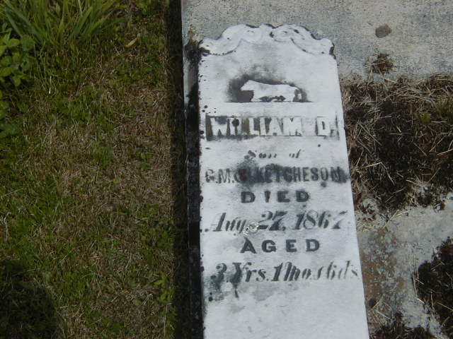 William D. Ketcheson was born on 21 July 1864 at Madoc Twp., Hastings Co., Canada West; Date July 21 1864 per Memorial - age 3y 1m 6d at death Aug 27 1867.1 He died on 27 August 1867 at Madoc Twp., Hastings Co., Ontario, at age 3; Date Aug 27 1867 per Memorial.1 He was buried on 29 August 1867 at Hazzards Corners Cemetery, Madoc Twp., Hazzards Corners, Hastings Co., Ontario; Memorial: (See Exhibit) William D; son of; G.M. & J. Ketcheson; Died; Aug. 27, 1867; Aged; 3 Yrs. 1 Mo's 6 Ds (Hazzards Corners Cemetery, Madoc Twp., by Dan, June 23, 2006.)1