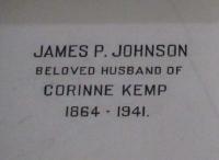 James P. Johnson was born on 11 December 1864 at Canada West; Date Dec 11 1864 & location Canada per FindaGrave. Date Dec 11 1864 & location Ont. urban per 1901 Census. "Muriel Gladys Purdy, only daughter of Mrs. James P. Johnston of Toronto" per marriage notice of Muriel Gladys Purdy.1,2,3 He married ? ? circa 1888; 1st wife per 1901 Census.2 James P. Johnson married Corinne Kemp, daughter of Charles Biggar Kemp and Emma Cory "Emily" Gross, on 5 December 1889 at Syracuse, New York, U.S.A; New York State Marriage Index: Name: Purdy, Corinne; Date: Dec 5 1889; Place: Syr; #21035 (New York State Marrige Index, 1889, pg. 590 of 842, ancestry.ca.