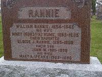 Eloise J. Rannie was born in 1895 at Ontario; Date 1895 per Memorial.1 She was buried in 1898 at Burnbrae Cemetery, Seymour Twp., Burnbrae, Northumberland Co., Ontario; Memorial: (See Exhibit) RANNIE; William Rannie, 1854-1945; His Wife; Mary (Hurstie) Hume, 1865-1955; Their Daughter; Eloise J. Rannie, 1895-1898; Their Son; John W. 1901-1998; His Wife; Mary A. (Peake) 1909-1996 (Burnbrae Cemetery, Seymour Twp., Nov 26 2011, by Dan.)1 She died in 1898 at Ontario; Date 1898 per Memorial.1