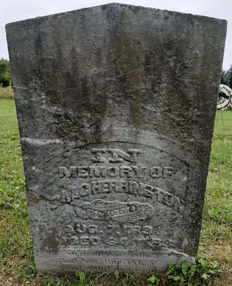 Isaac Herrington was born on 10 February 1827 at Northumberland Co., Upper Canada; Date 1827 per Memorial - age 64y at death Aug 7 1891. Date unknown - age 65y per FindaGrave. Date 1827 & location Ont. per 1891 Census. Date 1830 & location Ont. per 1881 Census. Date 1829 & location Ont. per 1871 Census. Date 1833 & location UC per 1861 Census. Date 1830 & location Cda. per 1851 Census. Date Feb 10 1831 & location Northumberland Co. per family tree of leecurrey on ancestry.ca, June 18 2021.1,2,3,4,5,6,7,8 He appeared on the census of 1852 at Brighton Twp., Northumberland Co., Canada West; Age 21 at 1851 Census: see John Dusenbury (who would soon be his father-in-law.)2 He married Susanna Maria Dusenbury, daughter of John Dusenbury and Wilhelmina Hess, on 12 December 1852 at Northumberland Co., Canada West; Date Dec 12 1852 & location Northumberland Co. per family tree of leecurrey on ancestry.ca, June 18 2021.1 Isaac Herrington lived on 16 October 1854 at Conc 3 Lot 35, Brighton Twp., Northumberland Co., Canada West; Land Registry Records (B&S A331) show that Harrison C. Bettes & wife sold 50 acres in the north east quarter of lot 35, Conc 3, Brighton Twp. to Isaac Herrington. ITS Date: Oct 16 1854. Reg'n. Date: Mar 8 1855. (Ontario Land Registry Records, Northumberland Co., Brighton Twp., page copied from OnLand.ca, 301 of 320, Lot 35, pg. 1, by Dan, Apr 13 2021.)9 He lived on 25 November 1855 at Conc 3 Lot 35, Brighton Twp., Northumberland Co., Canada West; Land Registry Records (Grant A623) show that Isaac Herrington & wife sold 50 acres in the north east quarter of lot 35, Conc 3, Brighton Twp. to John Moreland. ITS Date: Nov 25 1855. Reg'n. Date: Feb 18 1857. (Ontario Land Registry Records, Northumberland Co., Brighton Twp., page copied from OnLand.ca, 301 of 320, Lot 35, pg. 1, by Dan, Apr 13 2021.)9 He appeared on the census of April 1861 at Brighton Twp., Northumberland Co., Canada West; Age 28 at 1861 Census: Herrington, Isaac, 28, b. UC, EM, sawyer, married; Susan, 24, b. UC, EM, married; Stephen, 10; Sarah, 7; Rosilla, 5; Jacob, 3; Geo., 2 (1861 Census: Brighton Twp., Northumberland Co., pg. 389 of 899, line 47 - ancestry.ca)(Note: Benjamin Dusenbury is next.)3 He appeared on the census of April 1871 at Brighton Twp., Northumberland East Co., Ontario; Age 42 at 1871 Census: Herrington, Isaac, 42, b. Ont., Eng., Meth., Sawyer, married; Mariah, 30, b. Ont., Eng., Meth., married; Stephen, 19, b. Ont., Eng., Meth., single; Sarah A., 16; Rosilla, 14; Jacob, 12; George, 11; Ida, 9; John, 4 (1871 Census: Brighton Twp., Northumberland East Co., dist. 55, sub-dist. C-2, pg. 46 (106 of 334), line 9 - ancestry.ca.)8 He appeared on the census of April 1881 at Haldimand Twp., Northumberland West Co., Ontario; Age 51 at 1881 Census: Herrington, Isaac, 51, b. Ont., Irish, CM, lumberman, married; Susanna, 46, b. Ont., Irish, CM, married; Sarah A., 24, b. Ont., Irish, single; Jacob, 20, b. Ont., Irish, CM, farmer, single; Rossilla, 22, b. Ont., Irish, CM, single; George, 18, b. Ont., Irish, CM, farmer, single; Isa V., 17; John, 15; Dusenbury, Benjamin, 46, b. Ont., Irish, CM, farmer, single; Black, William, 24, b. Ont., Irish, CM, lab., single (1881 Census: Haldimand Twp., Northumberland West Co., page 76 of 113, line 3 - ancestry.ca)(Stephen Herrington, age 26, is next.)4 He appeared on the census of 11 April 1891 at Haldimand Twp., Northumberland West Co., Ontario; Age 64 at 1891 Census: Herrington, Isaac, 64, b. Ont., p.b. Ont., farmer & saw mill, married; Susannah, 64, b. Ont., p.b. Ont., Meth., married; Rozilla, 28, b. Ont., p.b. Ont., Meth., single; John, 22, b. Ont., p.b. Ont., Meth., farmer & saw mill, single; Dusenbury, Benjamin, 50, b. Ont., p.b. Ont., Meth., farm lab., single (1891 Census: Haldimand Twp., Northumberland West Co., dist. 99, sub-dist. C-6, pg. 7, line 13 - ancestry.ca)(Stephen Herrington, age 38, is below.)5 He died on 7 August 1891 at Northumberland Co., Ontario, at age 64; Date Aug 7 1891 per Memorial & FindaGrave. Date Aug 7 1891 & location Northumberland Co. per family tree of leecurrey on ancecstryl.ca, June 18 2021.1,10,7 He was buried on 9 August 1891 at Bethel United Cemetery, Haldimand Twp., Northumberland Co., Ontario; Memorial: (see Exhibit) In; Memory; of; Isaac Herrington; Died; Aug. 7, 1891; Aged 64 Y'rs. (Bethel United Cemetery, Haldimand Twp., image from FindaGrave.)