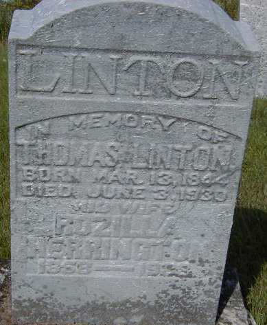 Thomas Linton was born on 13 March 1844 at Hamilton Twp., Northumberland Co., Canada West; Date Mar 13 1844 per Memorial. Date Mar 13 1844 & location Hamilton Twp. per CemSearch. Date 1849 & location Ont. per 1891 Census. Date 1851 & location Brighton Twp. per marriage reg'n. - Rosilla Herrington.1,3,2,4 He appeared on the census of 11 April 1891 at Haldimand Twp., Northumberland West Co., Ontario; Age 42 at 1891 Census: see William Linton.1 He appeared on the census of 17 April 1901 at Haldimand Twp., Northumberland West Co., Ontario; Age 55 at 1901 Census: see John Herrington (further brother-in-law.)5 He married Rozilla Herrington, daughter of Isaac Herrington and Susanna Maria Dusenbury, on 7 August 1905 at Cobourg, Northumberland Co., Ontario; Marriage Reg'n.#014375: Groom: Thomas Linton; Age: 54; Res.: Haldimand Twp; Born: Brighton Twp; Status: bachelor; Occ.: farmer; Parents: William Linton & Agnes Cummings; Bride: Rositte Herrington; Age: 40; Res.: Haldimand Twp; Born: Brighton Twp; Status: spinster; Parents: Isaac Herrington & Susan Dusenbury; Wit.: Marion McCaskill & Emma Bresver, Cobourg; Date: Aug 7 1905; Place: Cobourg; Rel.: Pres. & Meth; Performed by: Wm. Beattie; Reg'd.: Aug 9 1905; Reg'r.: D. H. Minaker, Cobourg (Ontario Marriage Registrations, #014375-1905, ancestry.ca.)6 Thomas Linton lived on 7 August 1905 at Haldimand Twp., Northumberland Co., Ontario; Residence Haldimand Twp. per marriage reg'n. - Rosilla Herrngton.3 He died on 3 June 1930 at Ontario at age 86; Date June 3 1930 per Memorial & CemSearch.2,4 He was buried on 5 June 1930 at Macklin's Cemetery, Haldimand Twp., Northumberland Co., Ontario; Memorial: (see Exhibit) LINTON; In Memory of; Thomas Linton; Born Mar. 13, 1844; Died June 3, 1930; His Wife; Rozilla; Herrington; 1858- 1933 (Macklin's Cemetery, Haldimand Twp., by Dan)