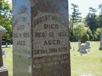 Note: The number of days in the age are not so clear, could be 20, 23, 26 or 28 - take your pick. Until I look directly at the stone again, my best evaluation of the images I see is that it is 26. (Dan Buchanan, Aug 31 2021.)1,2 He died on 17 December 1866 at Oneida Co., New York, U.S.A., at age 38; Date Dec 17 1866 & location Oneida Co., NY per CemSearch.1 He was buried on 20 December 1866 at Waite Cemetery, Cramahe Twp., Northumberland Co., Canada West; Mmeorial: (see Exhibit) Robert Wade, Jr; Died; Dec. 17, 1866; Aged; 38 Yrs. 3 Mo. & 23? D; Born in England; Died in Oneida Co., NY (Waite Cemetery, Cramahe Twp., July 3 2004, by Dan)