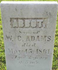 FindaGrave: Name: Abbot Adams; BIRTH: unknown; DEATH: 15 May 1861; BURIAL: Carman Cemetery, Carman, Northumberland County, Ontario, Canada; PLOT: Row 7; MEMORIAL ID: 113276109 (https://www.findagrave.com/memorial/113276109/abbot-adams.)1,3