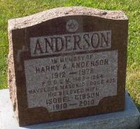 Harry Albert Anderson was born on 7 April 1913 at Belmont Twp., Havelock, Peterborough Co., Ontario; Birth Reg'n.#046248: Name: Harry Albert Anderson; Date: Apr 7 1913; Parents: Robert Anderson & Margaret Balfour; Married; Havelock, Jan 1911; Phys; Dr. Holdcroft; Inf.: Robert Anderson, Barber, Havelock; Reg'r.: J.W. Bryans, Havelock (Ontario Birth Registration, #046248-1913, ancestry.ca) Date 1912 per Memorial & FindaGrave. Date 1913 & location Havelock per marriage reg'n. - Lilian Isabel Gibson.1,3,2,4 He lived on 14 September 1932 at Havelock, Peterborough Co., Ontario; Residence Havelock per marriage reg'n. - Lilian Isabel Gibson.1 He married Lilian Isabella "Bell" Gibson, daughter of George "Burton" Gibson and Myrtle Alice Fraser, on 14 September 1932 at The Manse, Havelock, Peterborough Co., Ontario; Marriage Reg'n.#016390: Groom: Harry Albert Anderson; Age: 19; Res. & Born: Havelock; Status: bachelor; Occ.: barber; Rel.: Pres; Parents: Robert Anderson & ?Meegash Dalfour?; Bride: Lillian Isabel Gibson; Age: 22; Res.: Belmont Twp., Peterborough Co; Born: Murray Twp., Northumberland Co; Status: spinster; Rel.: Pres; Parents: Burton Gibson & Myrtle Fraser; Wit.: Enrest J. Sanderson, Havelock & Vella Bird, Weston, Ont; Date: Sep 14 1932; Place: The Manse, Havelock; Performed by: ?L. Beaton?, Havelock, Pres; Sworn: Peterborough, Sep 7 1932; Reg'r.: S. R. Armstrong, Peterborough (Ontario Marriage Registration, #016390-1932, ancestry.ca.)5 Harry Albert Anderson was buried in 1978 at Maple Grove Cemetery, Havelock, Peterborough Co., Ontario; Memorial: (see Exhibit) ANDERSON; In Memory of; Harry A. Anderson; 1912 - 1978; P.D.D.G.M. 1963-1964; Havelock Masonic Lodge 435; His Beloved Wife; Isobel Gibson; 1910 - 2010 (Maple Grove Cemetery, Havelock, image from FindaGrave Dec 18 2021)