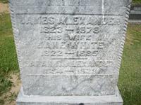 James Alexander was born in 1823 at Ireland; Date 1823 per Memorial & CemSearch. Date 1822 & location Ireland per 1871 Census. Date 1824 & location Ireland per 1861 Census. Location Ireland per Death Reg'n. of dau. Sarah A. Alexander.1,2,3,4,5 He married Jane White circa 1853 at Canada West; per 1861 Census.1 James Alexander appeared on the census of April 1861 at Brighton Twp., Northumberland Co., Canada West; Age 37 at 1861 Census: Alexander, James, 37, b. Ireland, CE, farmer, married; Jane, 37, b. Ireland, CE, married; Sarah A., 7, b. UC, CE; Hannah, 4 (1861 Census: Brighton Twp., Northumberland Co., pg. 338 of 899, line 33 - ancestry.ca.)1 He appeared on the census of April 1871 at Brighton, Northumberland East Co., Ontario; Age 49 at 1871 Census: Alexander, James, 49, b. Ireland, Irish, CE, farmer, married; Jane, 49, b. Ireland, Irish, CE, married; Sarah A., 16, b. Ont., Irish, CE; Hannah, 13 (1871 Census: Brighton Vilalge, Northumberland East Co., dist. 55, sub-dist. D, pg. 27, line 3 - ancestry.ca.)2 He was buried in 1878 at Mount Hope Cemetery, Brighton, Northumberland Co., Ontario; Memorial: (see Exhibit) James Alexander; 1823-1877; His Wife; Jane White; 1822-1885; Sarah A. Alexander; 1854-1939 (Mount Hope Cemetery, Brighton, image by Dan Buchanan, Jul 7 2004)