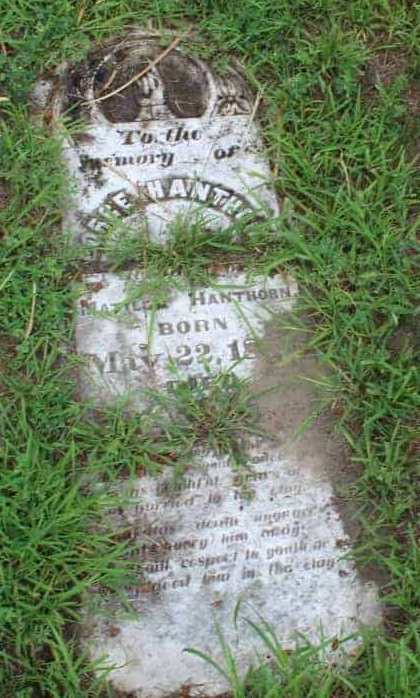 CemSearch: Name: George Hanthorn; Born: May 22 1828; Died: May 16 1857; ID: CNTNRY218; No other names; Cemetery: Centenary Cemetery, Conc 1, Lot 8, Alnwick Twp., Northumberland Co; Note: Deteriorated stone, son of Robert Hanthorn. (https://www.cemsearch.ca/burial/?pid=CNTNRY218%5E0)