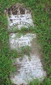 Date May 16 1857 per CemSearch. "Drowned in Rice Lake" per family tree of Bonnie Compton on ancestry.ca, Mar 1 2022.1,3 He was buried on 18 May 1857 at Centenary Cemetery, Alnwick Twp., Northumberland Co., Canada West; Memorial: (see Exhibit) To the; Memory of; George Hanthorn... ?Husband of; Matilda Hanthorn; Born; May 22 1828?; Died..... (Centenary Cemetery, Alnwick Twp., image from CemSearch, Mar 2 2022)