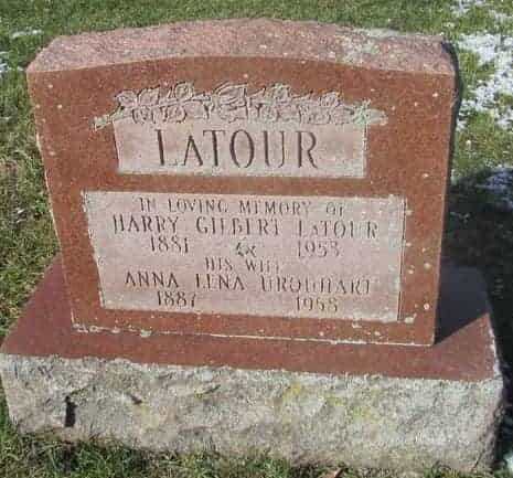 CemSearch: Name: Harry Gilbert Latour; Born: 1881; Died: 1953; Age: 72y; ID: CRYPLCK022; Other names: Latour, Anna Lena [Urguart] (1887-1958); Cemetery: Carrying Place Cemetery, Conc C, Lot 9, Murray Twp., Carrying Place, Northumberland Co; Note: Husband of Anna Lena Urquart Married Dec. 5th, 1905 in Prince Edward County Ontario,