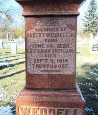 FindaGrave: Name: Robert Weddell Jr; BIRTH: 14 Jun 1850, Edinburgh, City of Edinburgh, Scotland; DEATH: 9 Sep 1919 (aged 69), Trenton, Hastings County, Ontario, Canada; BURIAL: Carrying Place Cemetery, Carrying Place, Murray Twp., Northumberland Co., Ontario, Canada; MEMORIAL ID: 113564066 (https://www.findagrave.com/memorial/113564066/robert-weddell)