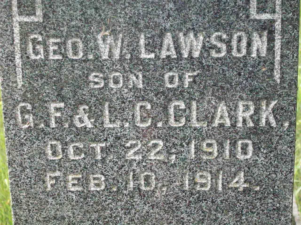 "Clark. In Brighton, on Tuesday morning, Feb. 10th, 1914, at 12:55 o'clock, George Wellington Lawson, only and dearly loved child of George F. and L. Carrie Clark, aged 3 yrs., 3 mos., 18 dys. The funeral service was held at his parent's residence, Prince Edward St., on Thursday, 12th inst., at 2 p.m., and interment took place at Wood's cemetery." from pg. 020 of Newspaper Clippings, a collection donated by Shawnee Spencer to the Brighton Digital Archives, 2022.4,5 He was buried on 12 February 1914 at Woods Cemetery, Cramahe Twp., Northumberland Co., Ontario; Memorial: (see Exhibit) Geo. W. Lawson; Son of; G.F. & L.C. Clark; Oct. 22, 1910; Feb. 10, 1914 (Woods Cemetery, Cramahe Twp., by Dan Buchanan, Jul 6 2009.)6