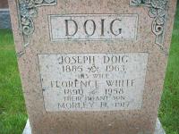 Morley Doig was born on 1 January 1917 at Brighton Twp., Smithfield, Northumberland Co., Ontario; Date 1914 per CemSearch. Date Jan 1 1917 & location Smithfield per Death Reg'n. - age 3 days at death Jan 4 1917. Death of a son Jan 3 1917 per newspaper clipping.1,3,2 He died on 3 January 1917 at Brighton Twp., Smithfield, Northumberland Co., Ontario; Death Reg'n.#022599: Name: Morley Donald Doige; Date: Jan 4 1917; Age: 3 days; Res. & Born: Smithfield, Brigton Twp; Parents: Joseph Doige & Florence White; Burial: Greenwood Cemetery, Smithfield; Cause: convulsions; Phys. & Inf.: F.M. Dure, Brighton; Reg'd.: Jan 5 1917 (Ontario Death Registration, #022599-1917, ancestry.ca)