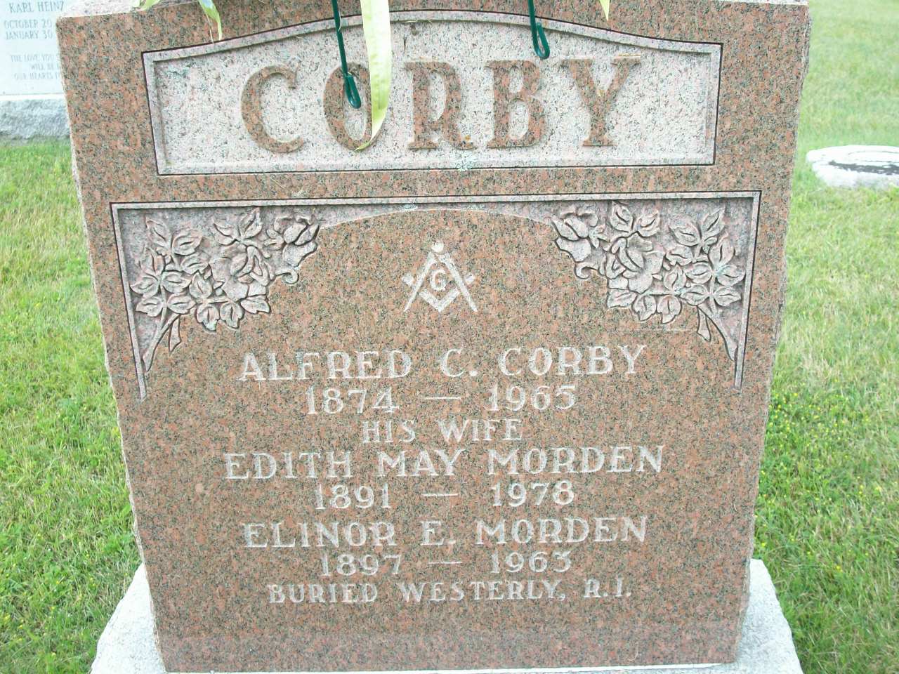 per family tree of stimersgenealogy on ancestry.ca, Feb 10 2023.1,7 Edith May Morden lived in 1965 at 72 Prince Edward St., Brighton, Northumberland Co., Ontario; 1965 Voters Lists: Corby, Mrs. Edith, widow, 72 Prince Edward St. (Canada Voters Lists, 1965, Brighton, Prince Edward West, north track, south Main....)8 She died in 1978 at Northumberland Co., Ontario; Date 1978 per Memorial & CemSearch. Date 1978 & location Northumberland Co. per family tree of stimersgenealogy on ancestry.ca, Feb 10 2023.1,2,4 She was buried in 1978 at Salem Cemetery, Cramahe Twp., Salem, Northumberland Co., Ontario; Memorial: (see Exhibit) CORBY; (Masonic Symbol) Alfred C. Corby; 1874 - 1965; His Wife; Edith May Morden; 1891 - 1978; Elinor e. Morden; 1897 - 1963; Buried Westerly, R.I. (Salem Cemetery, Cramahe Twp., image by Dan Buchanan, Jul 6 2009)