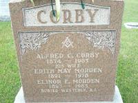 per family tree of stimersgenealogy on ancestry.ca, Feb 10 2023.1,9 Alfred Charles Corby lived on 9 November 1912 at Village Lot 24, Main St. North (82), Brighton, Northumberland Co., Ontario; Land Registry Records (Grant 4755) show that Thomas R. Corby sold "said lot - 20-foot frontage", part of Village Lot 24, Brighton Village, Northumberland Co. to Alfred Corby for $1. ITS Date: Nov 9 1912. Reg'n. Date: Nov 9 1912. (Ontario Land Registry Records, Northumberland Co., Brighton Village, Book 004, pg. 369 of 399, page copied from OnLand.ca by Dan Buchanan, Apr 13 2023.)10 He lived on 28 February 1927 at Village Lot 10, Prince Edward St. West (72), Brighton, Northumberland Co., Ontario; Land Registry Records (Grant 6208) show that Thomas W. Dale & wife & Nettie A. Dale who signs by power of atty. sold "part said lot, see as to well", Village Lot 10, Prince Edward St. West, Brighton Village, Northumberland Co. to Alfred C. Corby for $1,050. ITS Date: Feb 28 1927. Reg'n. Date: Mar 22 1927. (Ontario Land Registry Records, Northumberland Co., Brighton Village, Book 006, Pg 235 of 282, page copied from OnLand.ca by Dan Buchanan, Feb 8 2022.)10 He appeared on the census of 16 June 1931 at Prince Edward St. (Ward 2), Brighton, Northumberland Co., Ontario; Age 56 at 1931 Census: Corby, Alfred, 56, b. Ont., p.b. England & Ont., Eng., CE, monument manufacturer, married; Edith, 39, b. Ont., p.b. Ont., Eng., UC, married (1931 Census: Brighton Village, Northumberland Co., dist. 133, sub-dist. 58, pg. 16, line 39 - Ward 2 - Prince Edward St. - ancestry.ca.)11 He lived on 15 May 1933 at Village Lot 10, Prince Edward St. West (72), Brighton, Northumberland Co., Ontario; Land Registry Records (Grant Right of Way 6620) show that William W. Porte "Granted Right of Way" for "part lot, as see deed", Village Lot 10, Prince Edward St. West, Brighton Village, Northumberland Co. to Alfred C. Corby for $50. ITS Date: May 15 1933. Reg'n. Date: May 30 1933. (Ontario Land Registry Records, Northumberland Co., Brighton Village, Book 006, Pg 236 of 282, page copied from OnLand.ca by Dan Buchanan, Feb 8 2022.)10 He In 1938 a new post office was erected by the Dominion Government on North Main Street between Butlers Service Station and Corby's Monument Works." page 741 of The Tobey Book. in 1938 at 36 Main St., Brighton, Northumberland Co., Ontario.12 He lived on 8 March 1946 at Village Lot 24, Main St. North (82), Brighton, Northumberland Co., Ontario; Land Registry Records (Grant 7597) show that Alfred C. Corby & wife sold "said lot", part of Village Lot 24, Brighton Village, Northumberland Co. to Margaret R. Lapp for $1,000. ITS Date: Mar 8 1946. Reg'n. Date: Mar 20 1946. (Ontario Land Registry Records, Northumberland Co., Brighton Village, Book 004, pg. 369 of 399, page copied from OnLand.ca by Dan Buchanan, Apr 13 2023.)10 He "The old Corby building is twenty feet wide and sixty feet deep with parking and room for future expansion. (41 Main Street - Corby 36 Main Street)" from page 337 of The History of Brighton Businesses by Susan Brose, 2010. in 1948 at 36 Main St., Brighton, Northumberland Co., Ontario.7 He "After 79 years in business Alf Corby Monument Works is to officially close April 1, 1948. With the retirement of Mr. Corby, Brighton is now without a monument works for the first time in almost eighty years. Two years ago Mr. Corby sold this property, retaining possession for that period in order in wind up his business. The publisher of the paper is the present owner of the premises, having acquired the located with the hope of building a modern newspaper plant there at some future date. (36 Main Street)" from page 333 of The History of Brighton Businesses by Susan Brose, 2010. on 1 April 1948 at 36 Main St., Brighton, Northumberland Co., Ontario.7 He died in 1965 at Northumberland Co., Ontario; Date 1965 per Memorial & CemSearch. Date 1965 per family tree of stimersgenealogy on ancestry.ca, Feb 10 2023.1,5,6 He was buried in 1965 at Salem Cemetery, Cramahe Twp., Salem, Northumberland Co., Ontario; Memorial: (see Exhibit) CORBY; (Masonic Symbol) Alfred C. Corby; 1874 - 1965; His Wife; Edith May Morden; 1891 - 1978; Elinor e. Morden; 1897 - 1963; Buried Westerly, R.I. (Salem Cemetery, Cramahe Twp., image by Dan Buchanan, Jul 6 2009)