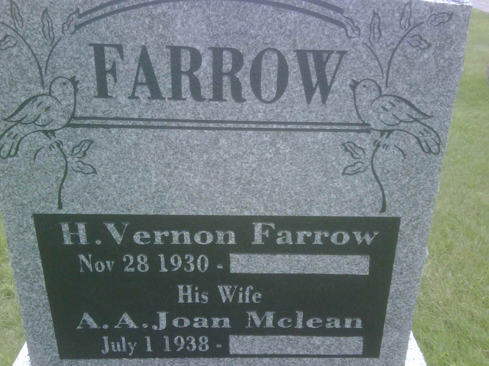 CemSearch: Name: H. Vernon Farrow; Born: Nov 28 1930; Died: Jul 29 2009; ID: SALEM0060; Other names: Farrow, A. A. Joan [McLean] (1938- ), Farrow, William Henry B. Vernon (1907-1963), Farrow, Leeta Murtle [Chaplin] (1903-1991); Cemetery: Salem Cemetery, Conc 1, Lot 21, Cramahe Twp., Salem Village, Northumberland Co., Sec 3 Row 12 Plot 11; Note: Husband of A. A. Joan McLeanm, Son of William Henry B. Farrow & Leeta Myrtle Chaplin. (https://www.cemsearch.ca/burial/?pid=SALEM0060%5E2.)2,3