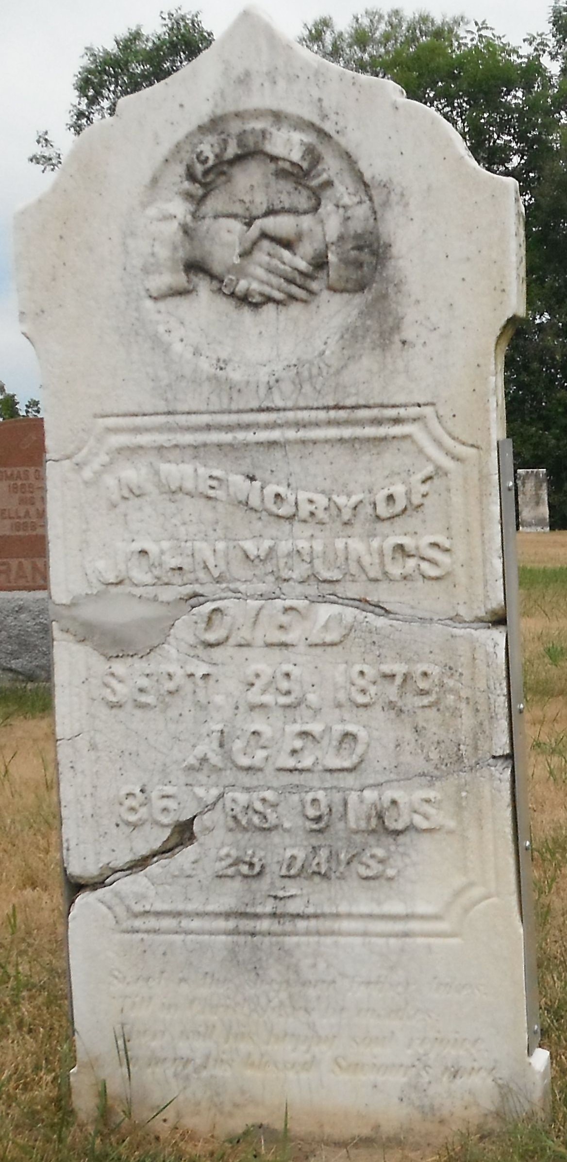 John Youngs was born on 4 December 1792 at Dutchess Co., New York, U.S.A; Date Dec 4 1792 per Memorial - age 86y 9m 25d at death Sep 29 1879. Date Dec 3 1792 per CemSearch - age 86y 9m 25d at death Sep 28 1879. Date 1793 & location Dutchess Co., NY per Death Reg'n. Date Jan 4 1793 & location NY per family tree of William Caufield on ancestry.ca, Dec 27 2024. Date 1802 & location Ont. per family tree of herbtreger_1 on ancestry.ca, Mar 10 2023.1,4,3,2 He married Sarah Walt, daughter of Augustine Henry Walt and Sarah ?, on 21 December 1818; Date Dec 21 1818 per family tree of William Caufield on ancestry.ca, Dec 27 2024. Date 1802 & location Ont. per family tree of herbtreger_1 on ancestry.ca, Mar 10 2023.1 John Youngs died on 29 September 1879 at Hillier Twp., Prince Edward Co., Ontario, at age 86; Death Reg'n.#012650: Name: John Youngs; Date: Sep 28 1879; Age: 86y; Occ.: farmer; Born: Duchess Co., NY; Cause: ? & gnagrene; Phys.: T.H. Thornton; Inf.: W. Tomblin, Methodist Minister, Consecon; Reg'd.: Oct. 3 1879; Rel.: Meth; Reg'r.: Franklin Jones, Hillier Twp., Prince Edward Co. (Ontario Death Registration, #012650-1879, ancestry.ca) Date Sep 1879 per CemSearch.5,3 He was buried on 30 September 1879 at Consecon Cemetery, Ameliasburgh Twp., Consecon, Prince Edward Co., Ontario; Memorial: (see Exhibit) In Memory of; John Youngs; Died; Sept. 29, 1879; Aged; 86 Y'rs, 9 Mos; & 25 Days. (Consecon Cemetery, Ameliasburgh Twp., Prince Edward Co., image from FindaGrave, Jun 17 2025)