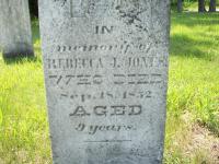 Rebecca J. Jones was born in 1843 at Cramahe Twp., Northumberland Co., Canada West; Date 1843 per Memorial - age 9 at death Sep 18 1852 - looks like either 1832 or 1852, but is most likley be 1852.