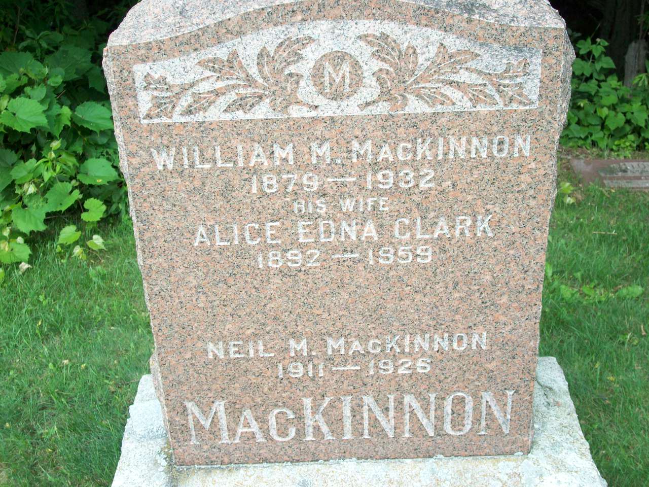 Date 1926 per Memorial. Date Oct 1926 per CemSearch.1,3,6 He was buried on 17 October 1926 at Woods Cemetery, Cramahe Twp., Northumberland Co., Ontario; Memorial: (see Exhibit) William M. MacKinnon; 1879 - 1932; His Wife; Alice Edna Clark; 1892 - 1959; Neil M. MacKinnon; 1911 - 1926; MacKINNON (Woods Cemetery, Cramahe Twp., image by Dan Buchanan, Jul 6 2009)