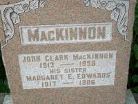 John Clark MacKinnon was born on 4 October 1913 at Brighton, Northumberland Co., Ontario; Birth Reg'n.#040917: Name: John Clark MacKinnon; Date: Oct 4 1913; Place: Brighton; Parents: William McCargow MacKinnon, farmer & Alice Edna Clark; Married: Oct 31 1909; Inf.: William M. MacKinnon, farmer, father, Brighton; Phys.: R. J. Wade; Reg'd.: Oct 5 1913; Reg'r.: ?? (Ontario Birth Registration, #040917-1913, ancestry.ca) Date 1913 per Memorial.3,4 He appeared on the census of 16 June 1931 at Ontario St., Brighton, Northumberland Co., Ontario; Age 18 at 1931 Census: see William MacKinnon.2 He died in 1958 at Ontario; Date 1958 per Memorial.4 He was buried in 1959 at Woods Cemetery, Cramahe Twp., Northumberland Co., Ontario; Memorial: (see Exhibit) MacKinnon; John Clark MacKinnon; 1913 - 1958; His Sister: Margaret E. Edwards; 1917 - 1966 (Woods Cemetery, Cramahe Twp., image by Dan Buchanan, Jul 6 2009.)4