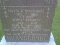 per 1931 Census.1,11 Milton Charles Branscombe appeared on the census of 1 June 1921 at Cramahe Twp., Northumberland Co., Ontario; Age 28 at 1921 Census: Branscombe, 28, b. Ont., p.b. Ont., Eng., Meth., farmer, married; Myrtle, 26, b. Ont., p.b. Ont., Eng., Meth., married; George, 7; Ross, 5; Earl, 4; Myrtle, 1; Delong, Harry, 50, b. Ont., p.b. Ont., Eng., Meth., farm lab., single (1921 Census: Cramahe Twp., Northumberland Co., dist. 107, sub-dist. 8, pg. 1, line 12 - ancestry.ca.)4 He appeared on the census of 3 June 1931 at Cramahe Twp., Northumberland Co., Ontario; Age 38 at 1931 Census: Branscombe, Milton Charles, 38, b. Ont., p.b. Ont., Scot., UC, farmer, married; Myrtle Augusta, 36, b. Ont., p.b. Ont. & USA, Eng., UC, married; George Milton, 17, b. Ont., p.b. Ont., Scot., UC, son; Ross Wilfred, 15; Earl Douglas, 13; Bertha Myrtle, 11; Hazel Francis, 9; Marjorie Eileen, 5; Albert Ezra, 3; Lola Marie, 9/12 (1931 Census: Cramahe Twp., Northumberland Co., dist. 133, sub-dist. 9, pg. 3, line 20 - anccestry.ca.)1 He lived in 1935 at R. R. # 4, Brighton, Northumberland Co., Ontario; "14 Branscombe, Milton, farmer, R.R. 4, Brighton" & "15 Branscombe, Mrs. M. (W) married woman, R.R. 4, Brighton" Canada Voters Lists, 1935, Northumberland Co., Cramahe Twp., pg. 59 of 126, ancestry.ca.12 He lived in 1949 at R. R. # 4, Brighton, Northumberland Co., Ontario; "26 Branscombe, Milton, farmer, R.R. No. 4, Brighton" & "27 Branscombe, Mrs. Milton - R.R. No. 4, Brighton" & "28 Branscombe, Ross, farmer, R.R. No. 4, Brighton" & "29 Branscombe, Earl, farmer, R.R. No. 4, Brighton" & "30 Branscombe, Albert, student, R.R. No. 4, Brighton" & "31 Branscombe, Miss Marjorie, teacher, R.R. No. 4, Brighton" Canada Voters Lists, 1949, Northumberland Co., Brighton Twp., pg. 80 of 156, ancestry.ca.12 He lived in 1965 at R. R. # 4, Brighton, Northumberland Co., Ontario; "57 Branscombe, Milton, engineer, R.R. 4, Brighton" & "58 Branscombe, Mrs. Milton - R.R. 4, Brighton" & "59 Branscombe, Earl, mechanic, R.R. 4, Brighton" Canada Voters Lists, 1965, Northumberland Co., Brighton Twp., pg. 56 of 148, ancestry.ca.12 He lived in 1972 at R. R. # 4, Brighton, Northumberland Co., Ontario; "14 Branscombe, Milton, retired, R.R. 4, Brighton" & "15 Branscombe, Mrs. Myrlte - R.R. 4, Brighton" Canada Voters Lists, 1972, Northumberland Co., Brighton Twp., pg. 119 of 361, ancestry.ca.12 He died in 1980 at Cobourg, Northumberland Co., Ontario; Date 1980 per Memorial & CemSearch. Date 1980 & location Cobourg per FindaGrave.2,3,9 He was buried in 1980 at Salem Cemetery, Cramahe Twp., Salem, Northumberland Co., Ontario; Memorial: (see Exhibit) Milton C. Branscombe; 1893 - 1980; His Wife; Myrlte Ventress; 1894 - 1983; Earl D. 1917 - 2004; Son of Milton & Myrtle; 1919 Bertha Branscombe 2005; Wife of 1916 Maurice R. Harrison 1996; BRANSCOMBE (Salem Cemetery, Cramahe Twp., image by Dan Buchanan, Jul 6 2009)