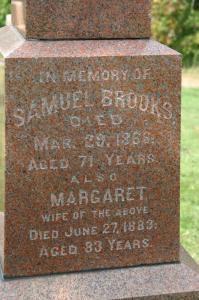 CemSearch: Name: Samuel Brooks; Born: - ; Died: Mar 29 1866; Age: 71y; ID: MTHOPE310; Other names: Brooks, Sarah J. (1839-1910), Brooks, Margaret ( -1883); Cemetery: Mount Hope Cemetery, Conc A, Lot 35, Brighton Twp., Brighton Village, Northumberland Co., Sec 1 Row 15; Note: Husband of Margaret. (https://www.cemsearch.ca/burial/?pid=MTHOPE310%5E0)