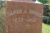 CemSearch: Name: Sarah J. Brooks; Born: 1839; Died: 1910; Age: - ; ID: MTHOPE310; Other names: Brooks, Samuel (18 -1866), Brooks, Margaret ( -1883); Cemetery: Mount Hope Cemetery, Conc A, Lot 35, Brighton Twp., Brighton Village, Northumberland Co., Sec 1 Row 15 (https://www.cemsearch.ca/burial/?pid=MTHOPE310%5E2)